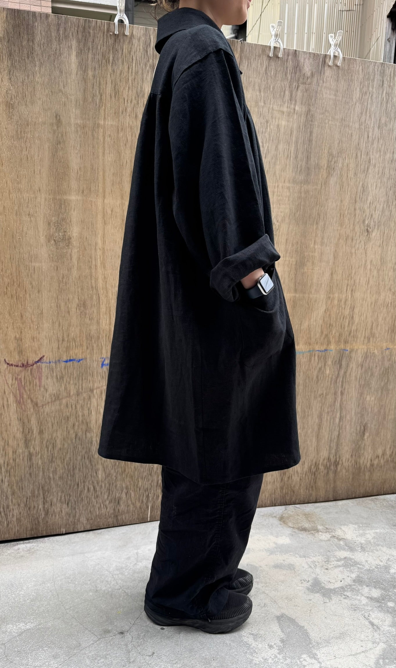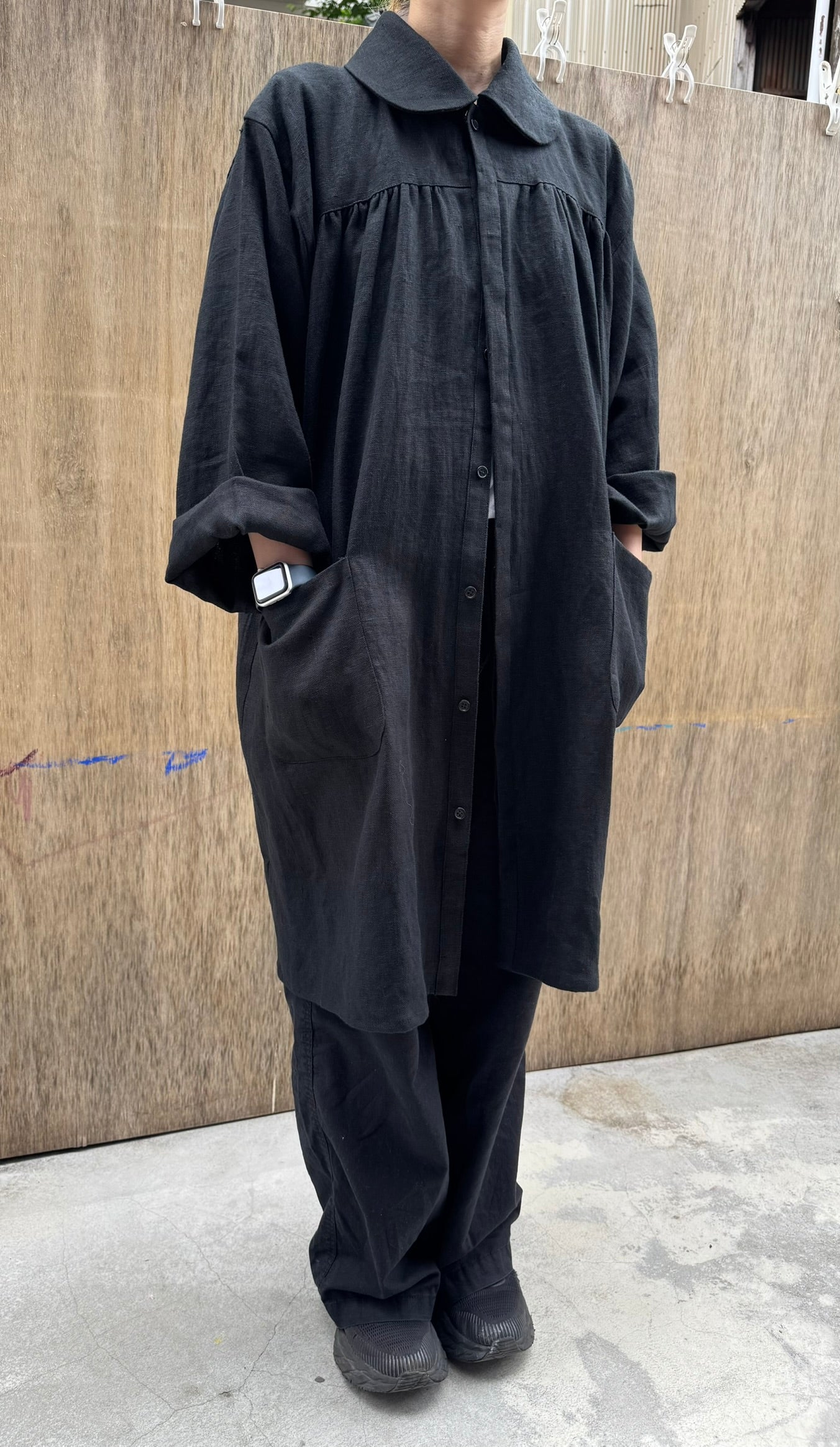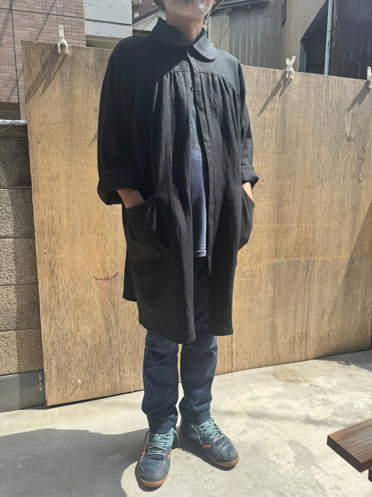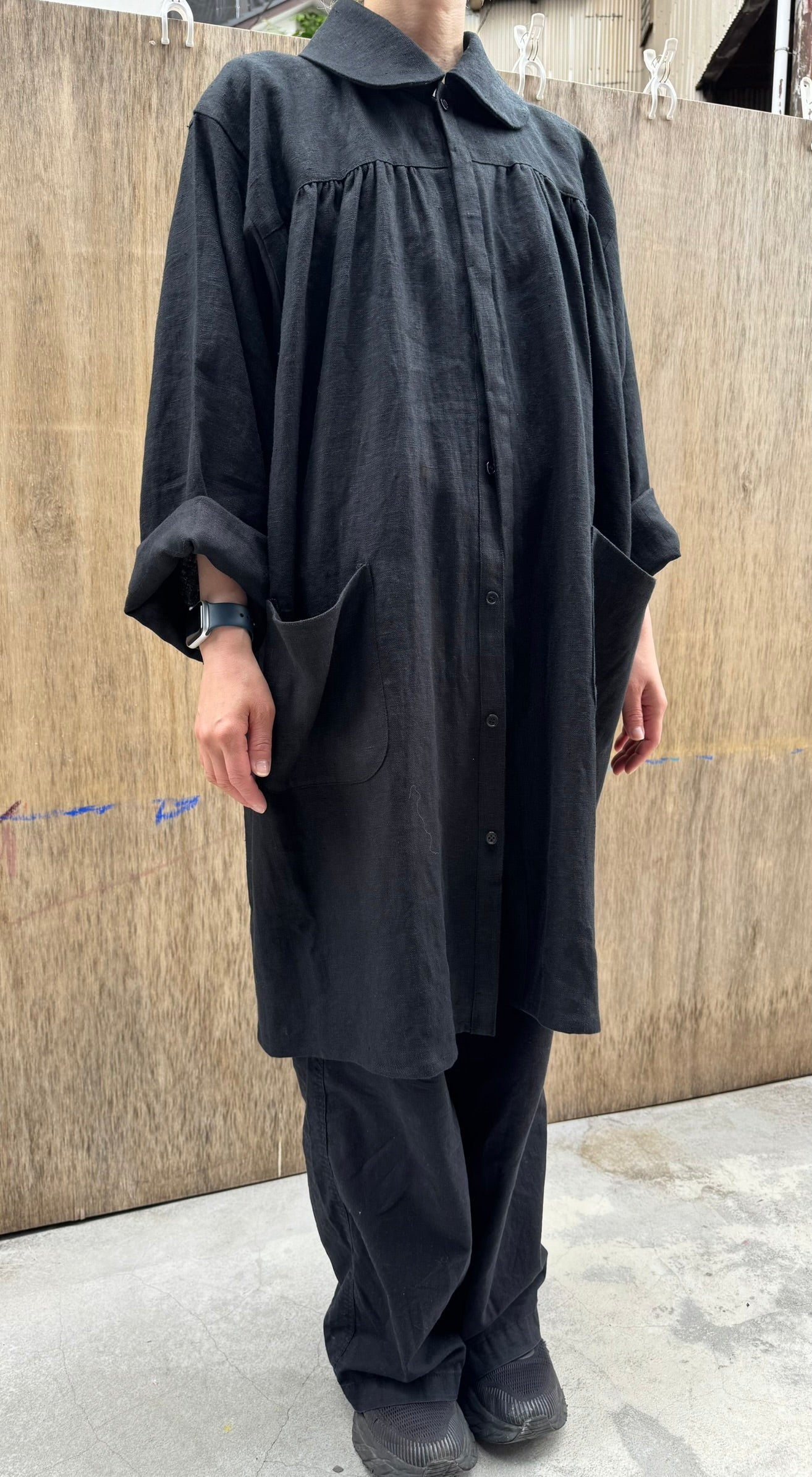 The wide sleeves and generous body allow for comfortable movement, even when layered over heavy clothing. We designed it so that it could be worn as an outer garment as well.