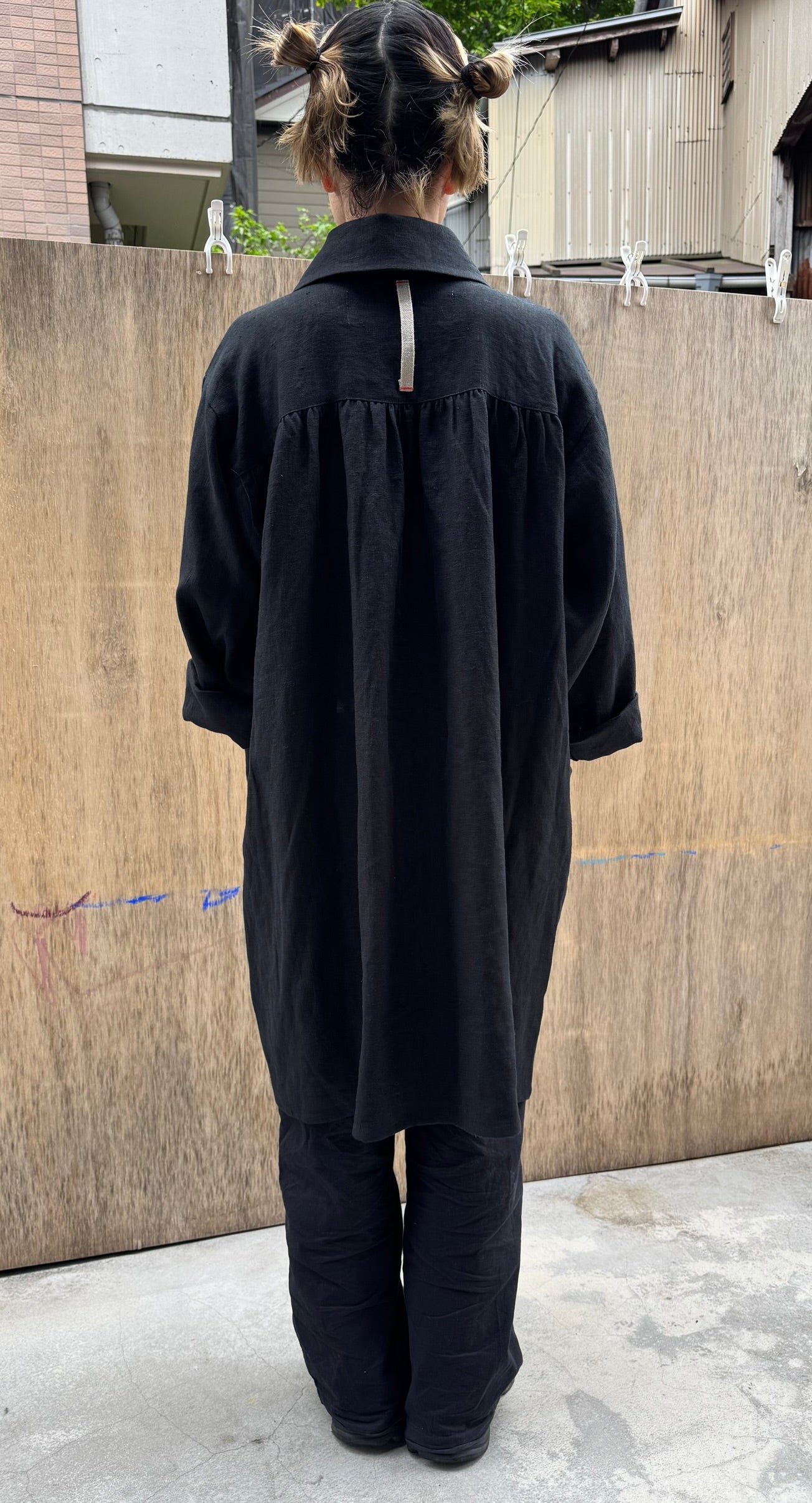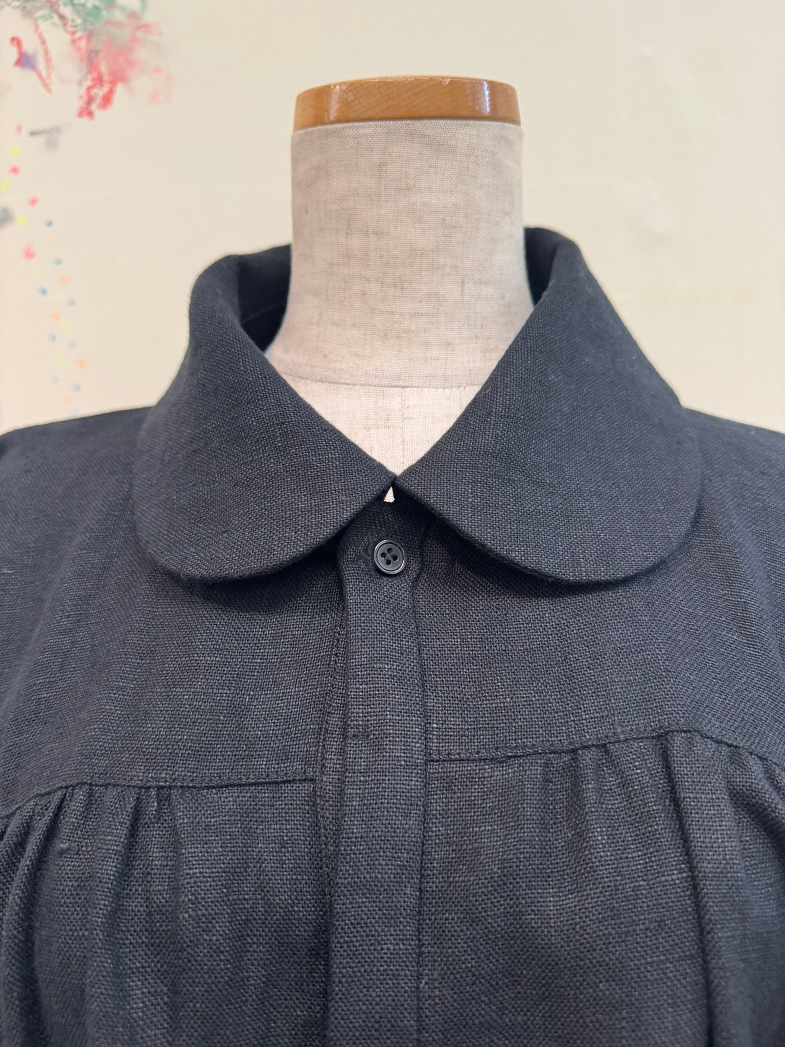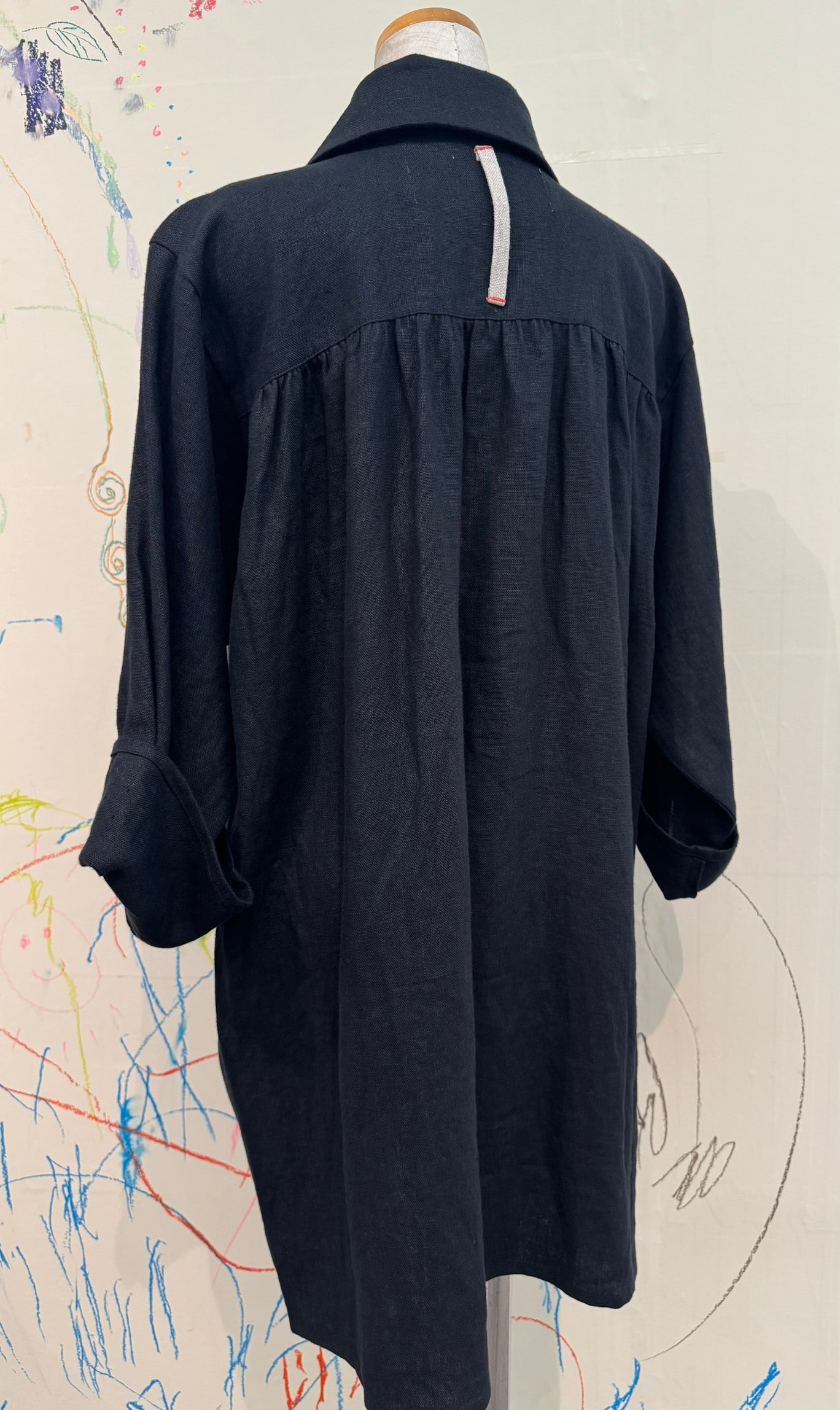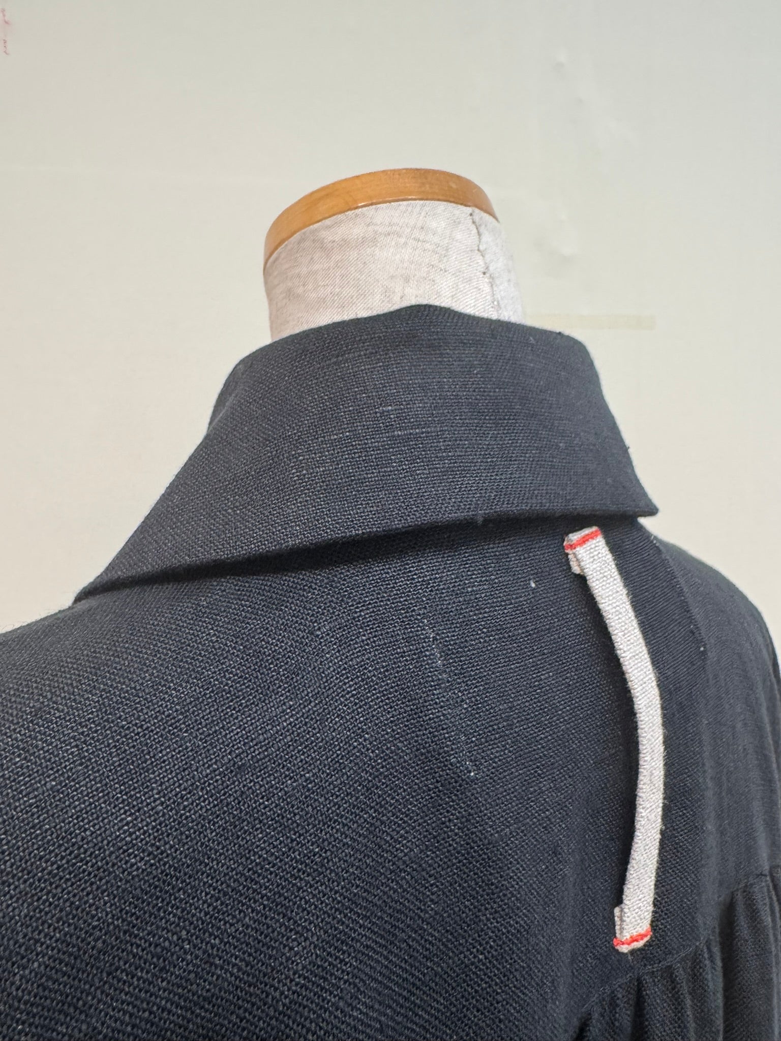 The strap under the collar on the back is made from linen canvas traditionally used for oil painting. It’s intended to let you hang up your smock — say, on an easel — after a day's work.