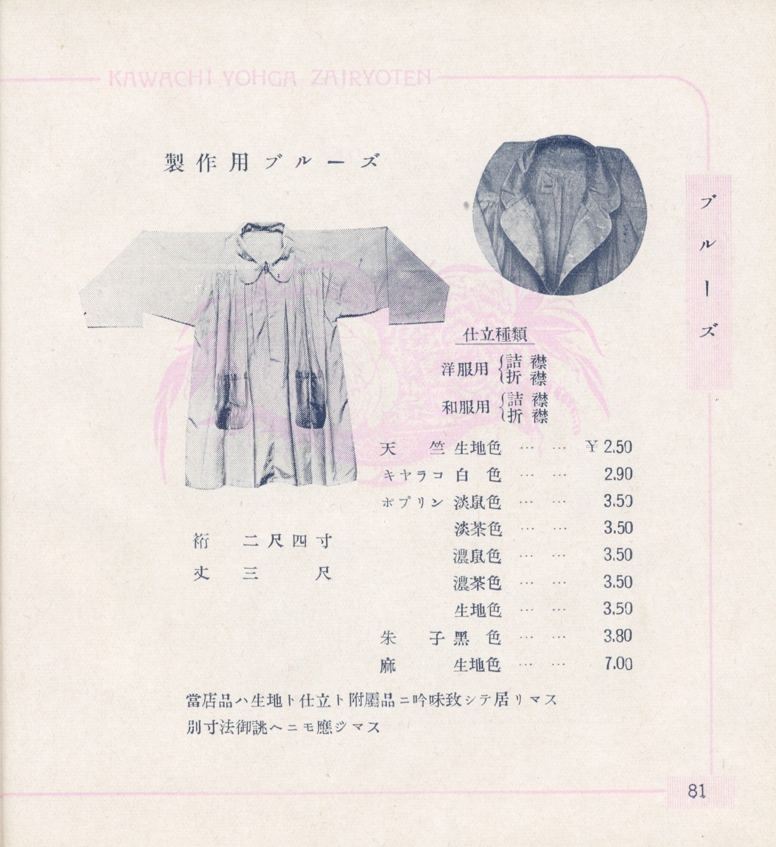 We have faithfully recreated an original blouse (smock) that was featured in the catalog of KAWACHI ART SUPPLIES SHOP, first published in 1929 (Showa 4).