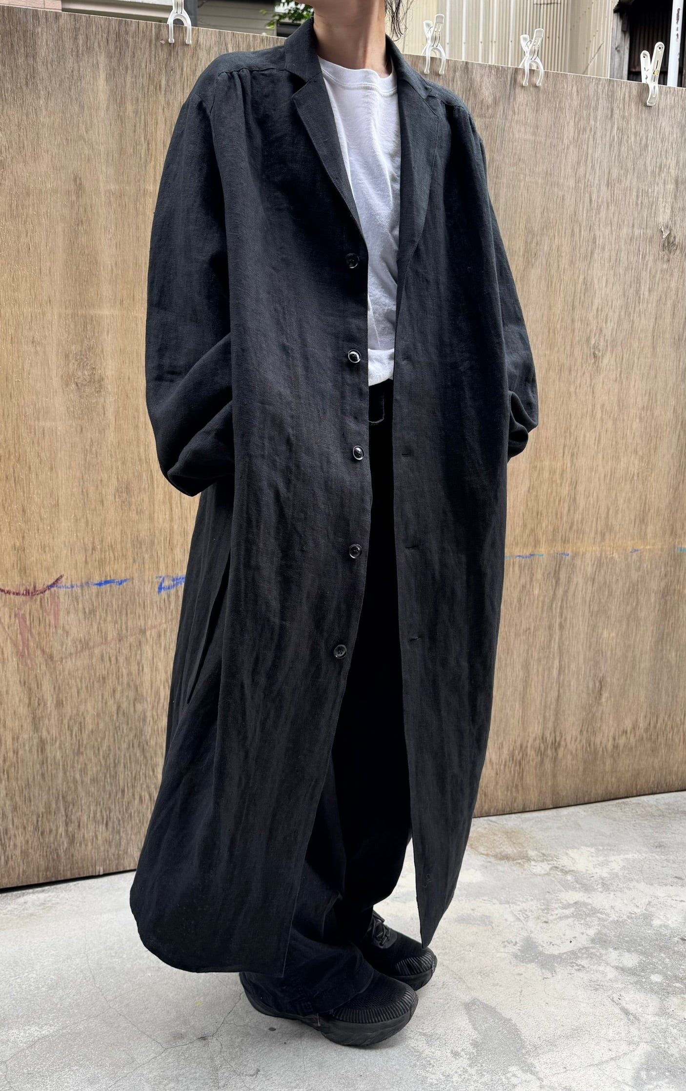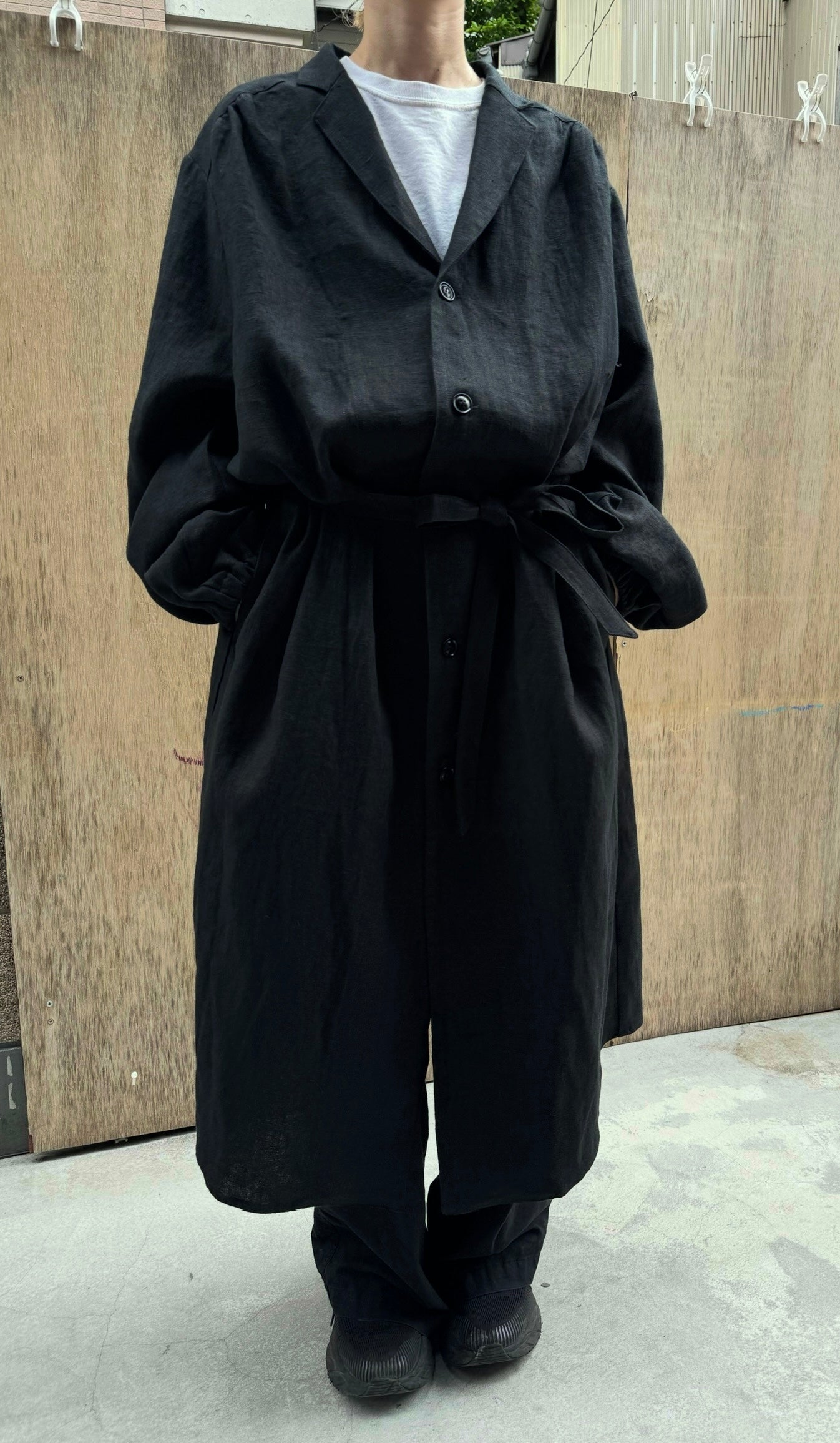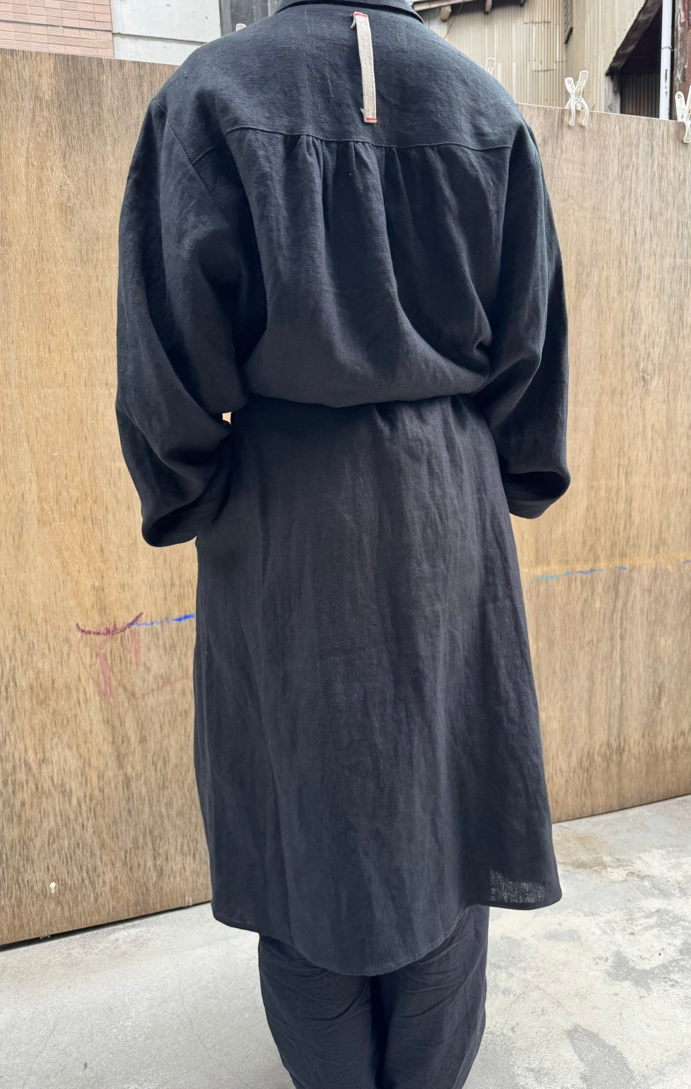 This blouse uses a fabric made from thick linen yarn, spun with the semi-wet spinning method — one of the oldest spinning techniques.