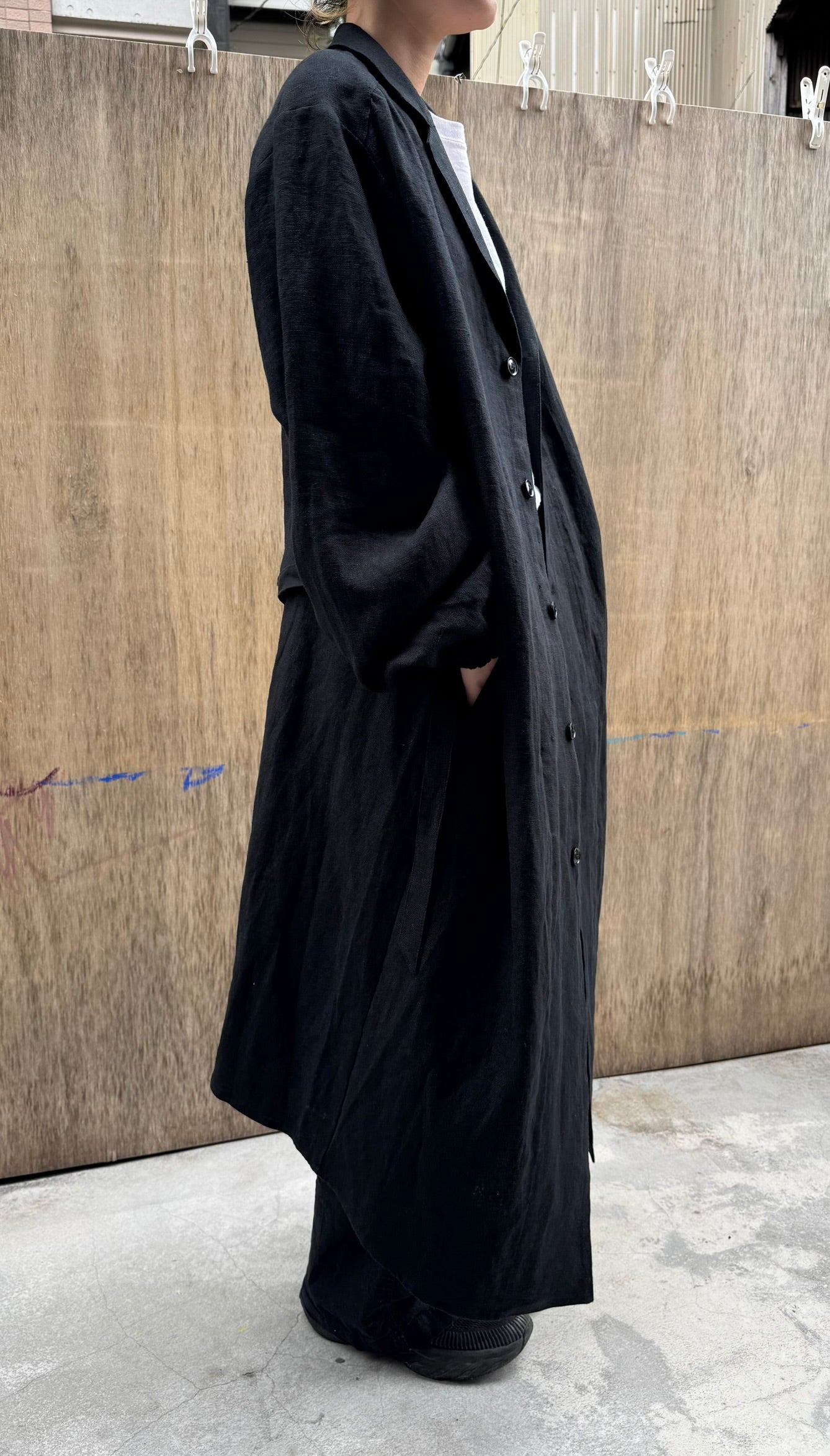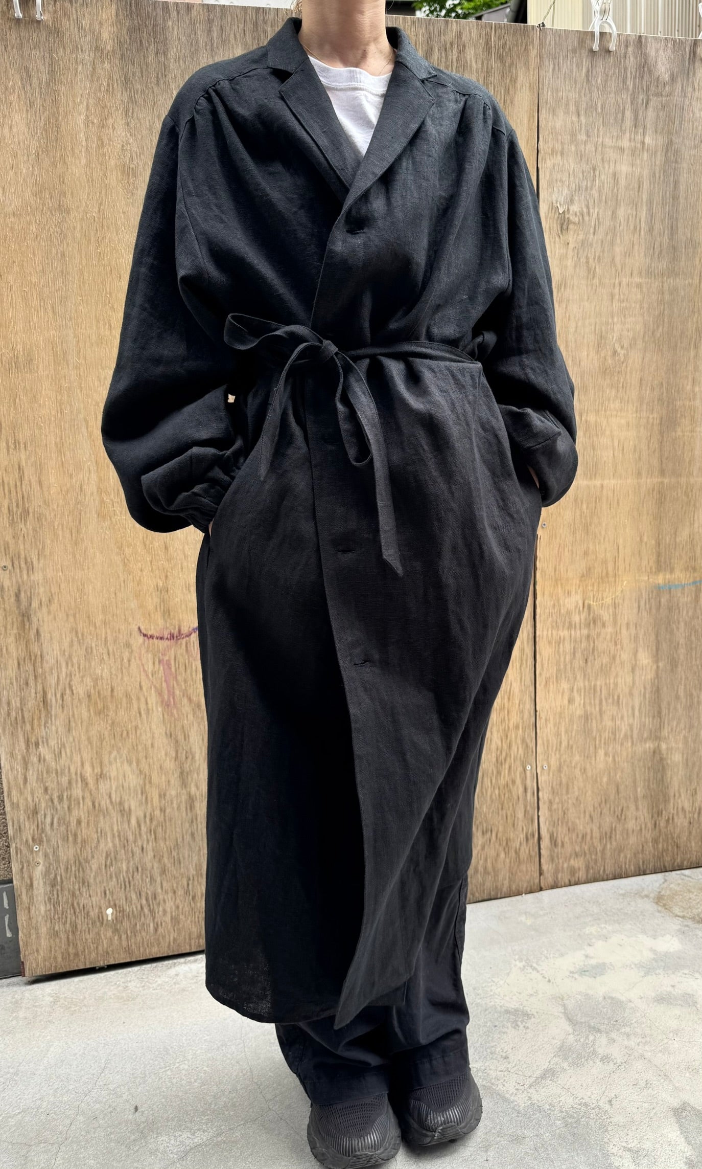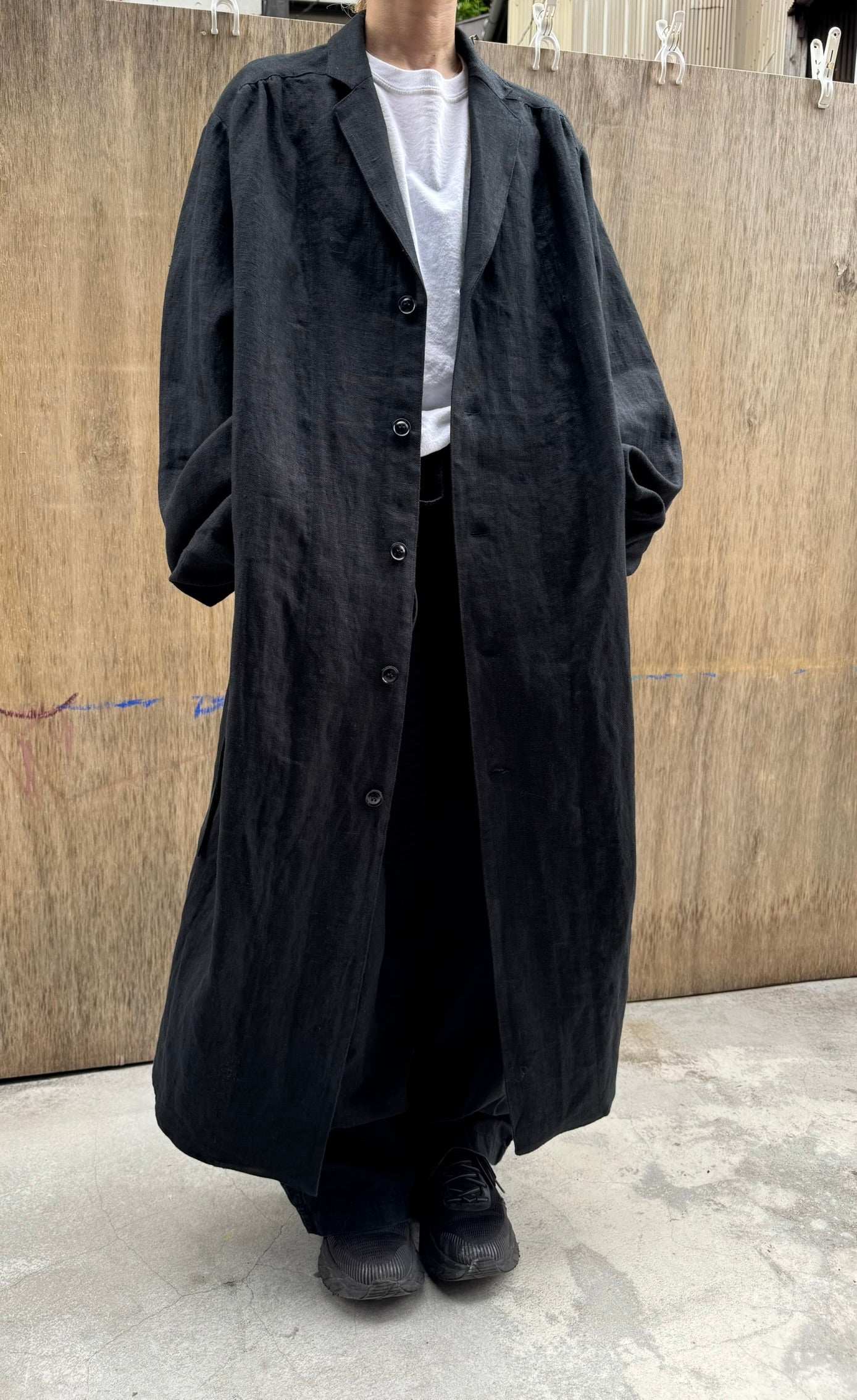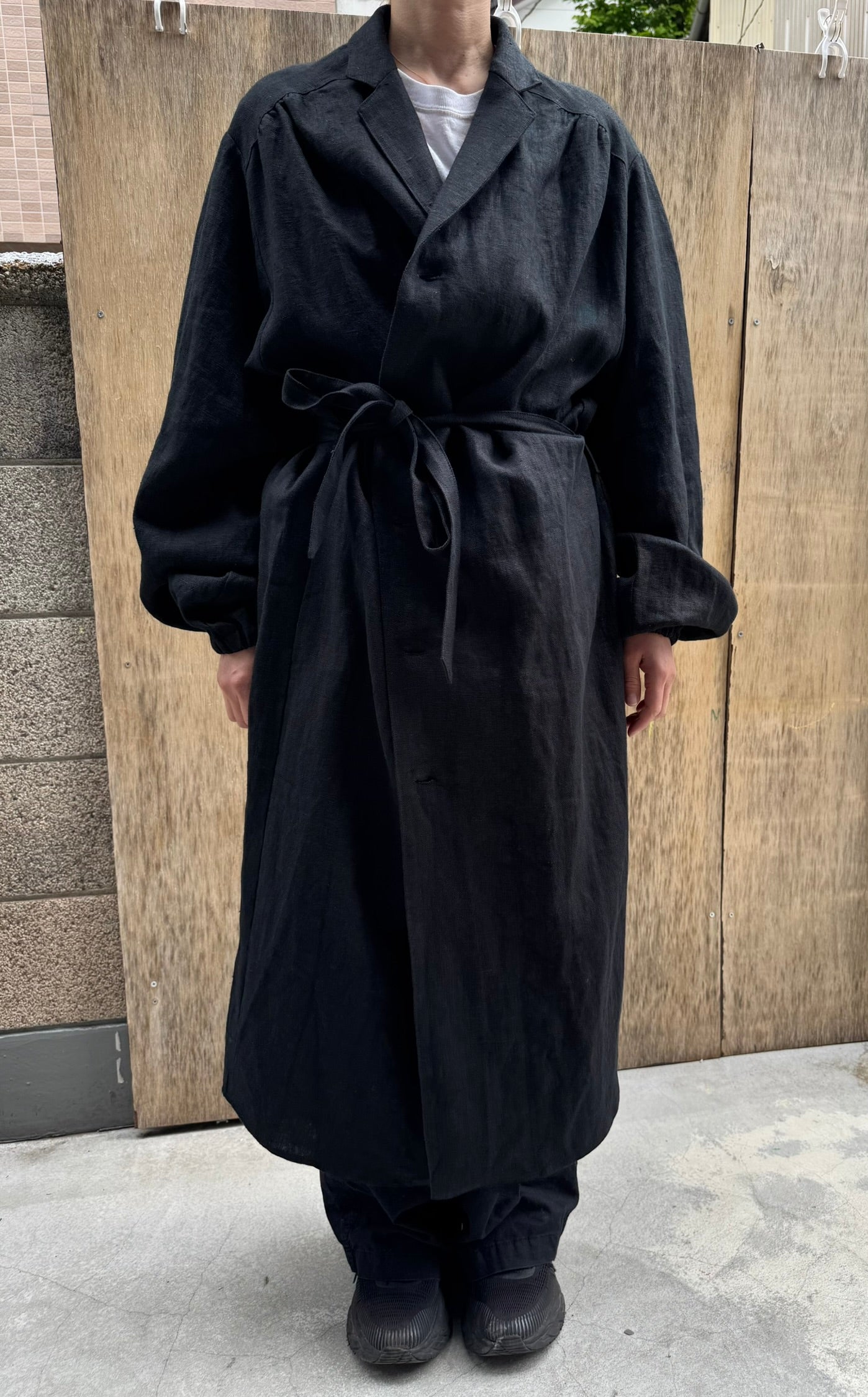 This blouse uses a fabric made from thick linen yarn, spun with the semi-wet spinning method — one of the oldest spinning techniques.